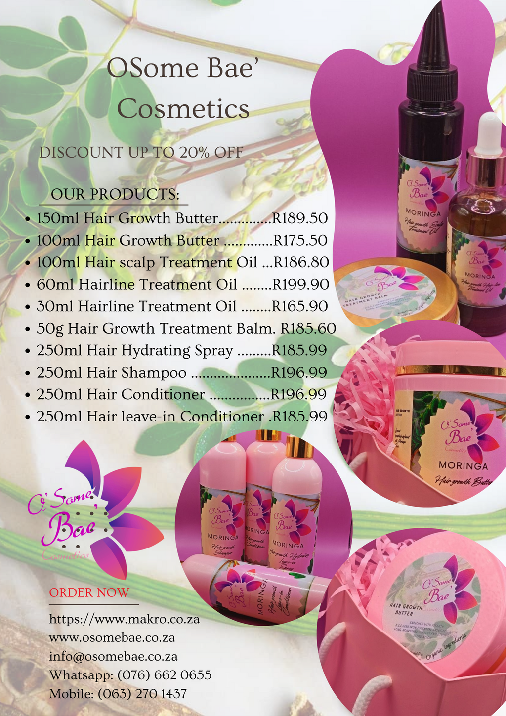 At O'Some Bae', we believe that beauty encompasses self-love and authenticity. Our exclusive hub offers tailored products aimed at enhancing your natural beauty, particularly with a focus on healthy hair. Our exclusive range of hair growth products, made from organic ingredients including the powerhouse Moringa plant, is designed to nourish and revitalize your hair. Embrace your natural glow with our handcrafted beauty accessories and discover the true essence of beauty with us!